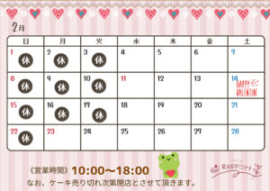 2026.01.31 2月のカレンダーです🍫 バレンタイン商品ならんでいます♪ ぜひご覧ください!! 2026年1月のカレンダーです🐎 前の記事 新着のお知らせ 2026.01.02 2026年1月のカレンダーです🐎 2024.03.26 なりまっぷさんに紹介してもらいました♪ 2024.03.07 ホームぺージを公開いたしました。