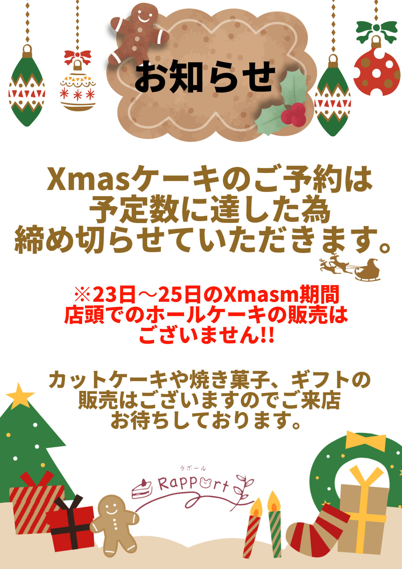 2025.12.13 Xmas期間のお知らせです! ※シュークリーム、タルト等お休みのケーキもございます💦 ご不便おかけ致しますがよろしくお願いいたします。 12月のカレンダーです🎅 前の記事 新着のお知らせ 2025.12.13 12月のカレンダーです🎅 2024.03.26 なりまっぷさんに紹介してもらいました♪ 2024.03.07 ホームぺージを公開いたしました。